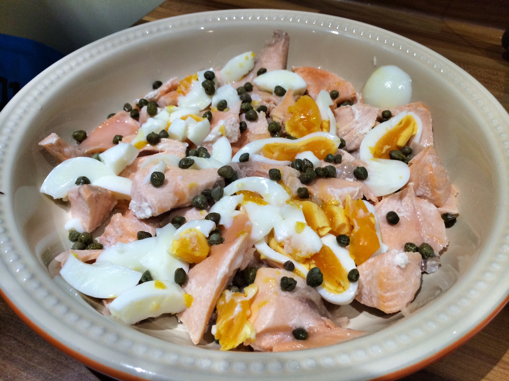 - Take off the heat then carefully remove the salmon, reserving the milk. In a pie dish, flake off the salmon fillets into fork-sized pieces, discarding the skin. Toss in the chopped up egg and capers at this point too.