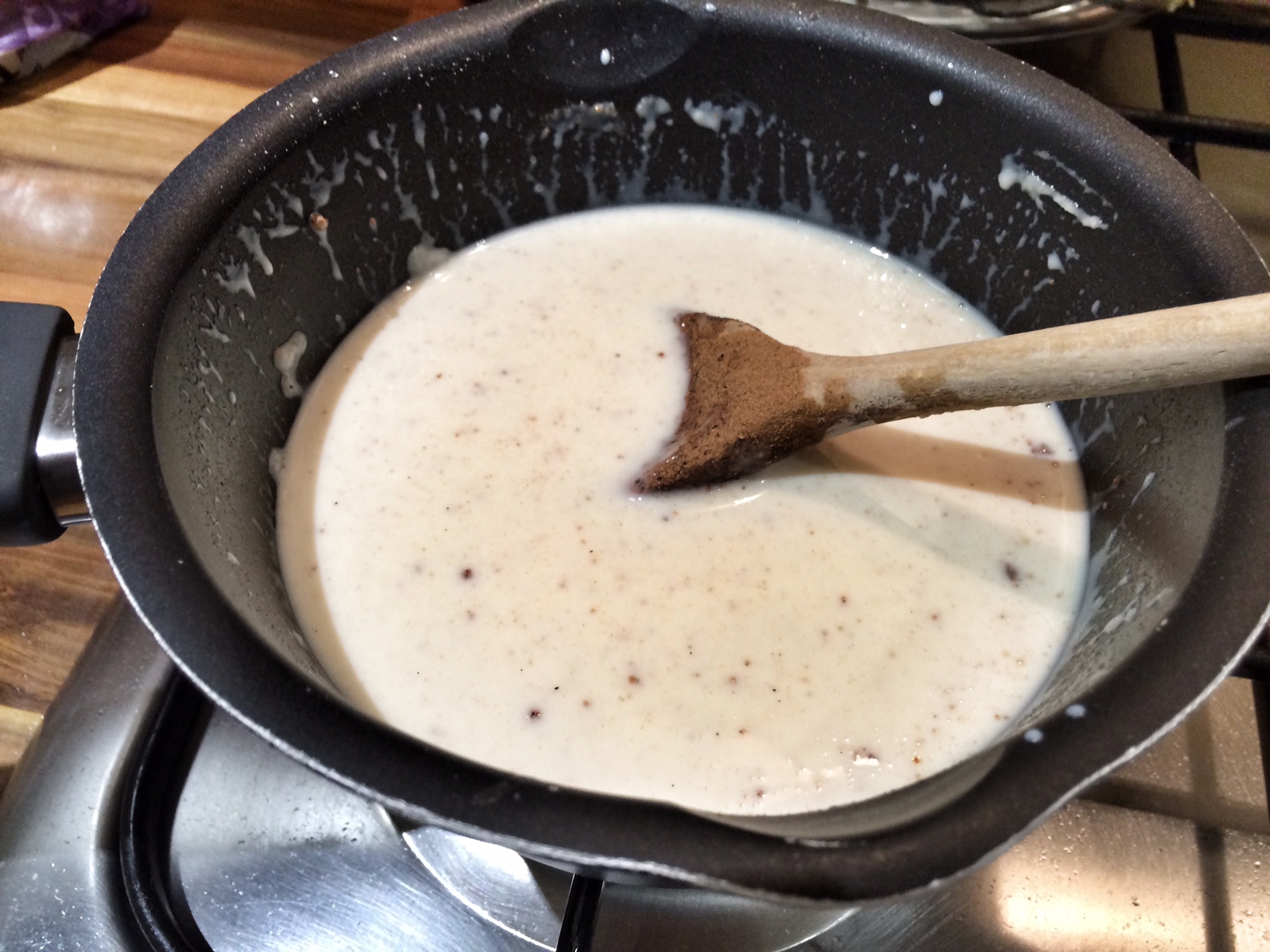 - In a small pan, melt the butter. Then add the flour and beat together over the heat for one minute. Take the pan off the heat, then gradually add the milk continually stirring. Add the nutmeg and give one final stir together. Pour into the pie dish over the other ingredients.