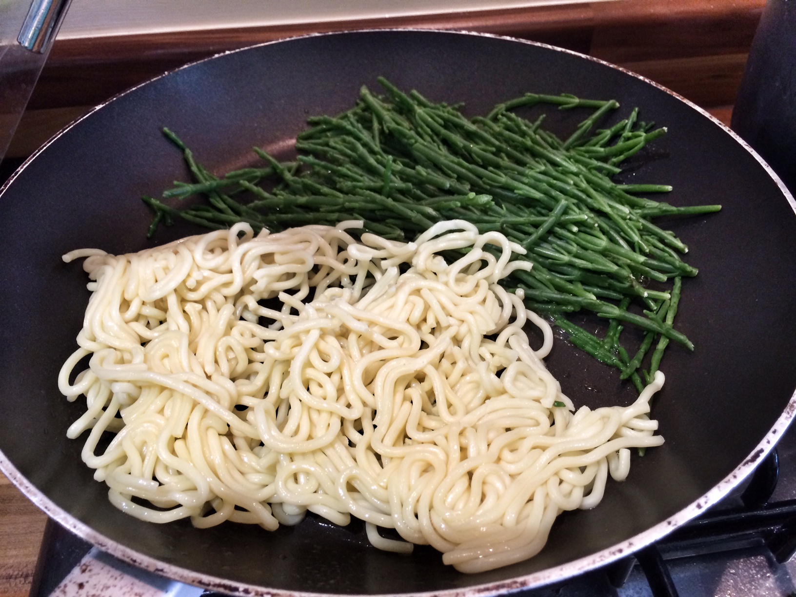 - In a separate frying pan, add the sesame oil, then toss in the noodles and samphire and stir around. This will just need a couple of minutes to heat up.