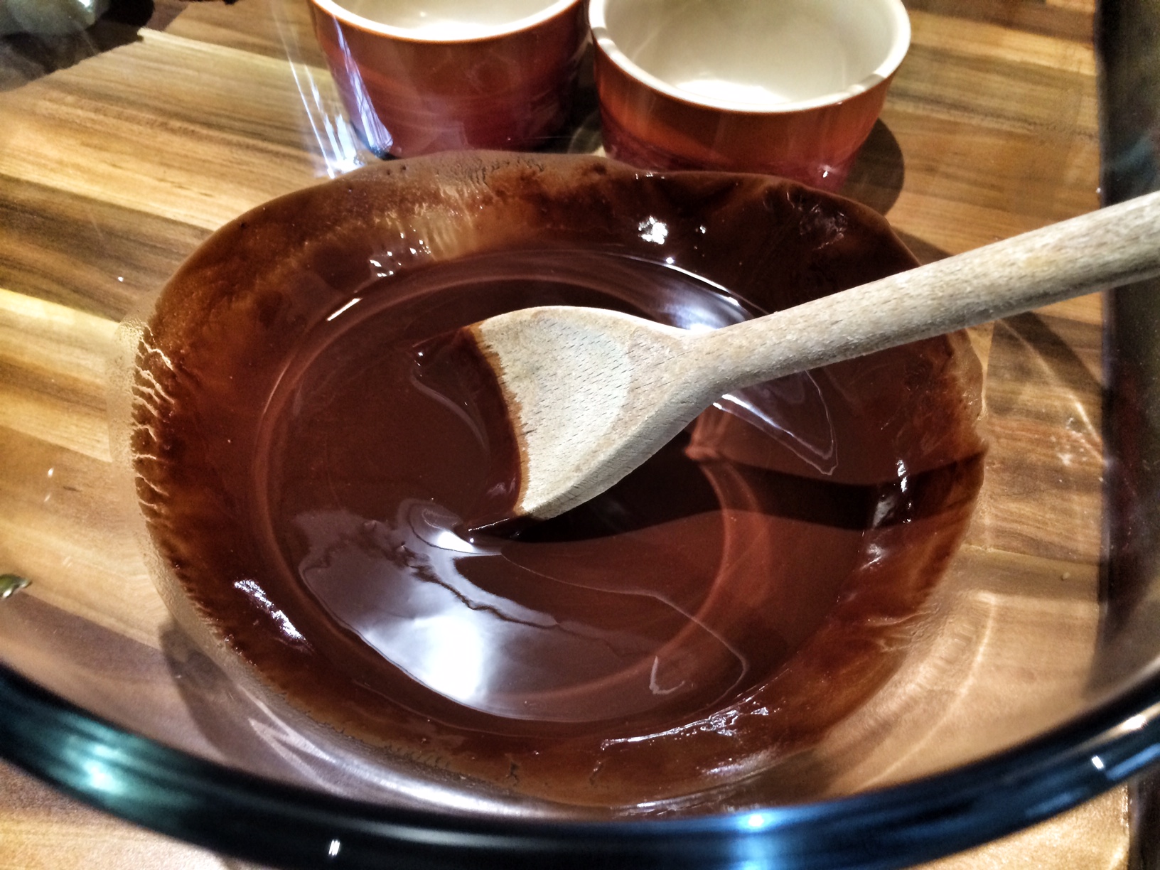 - When you’re ready to eat dessert, pre-heat the oven to 200ºC then place the fondants in the oven for 8 – 14 minutes, depending on the size of the ramekins. To check they’re cooked, poke one with a knife. It should come out with some melted fondant stuck to it.