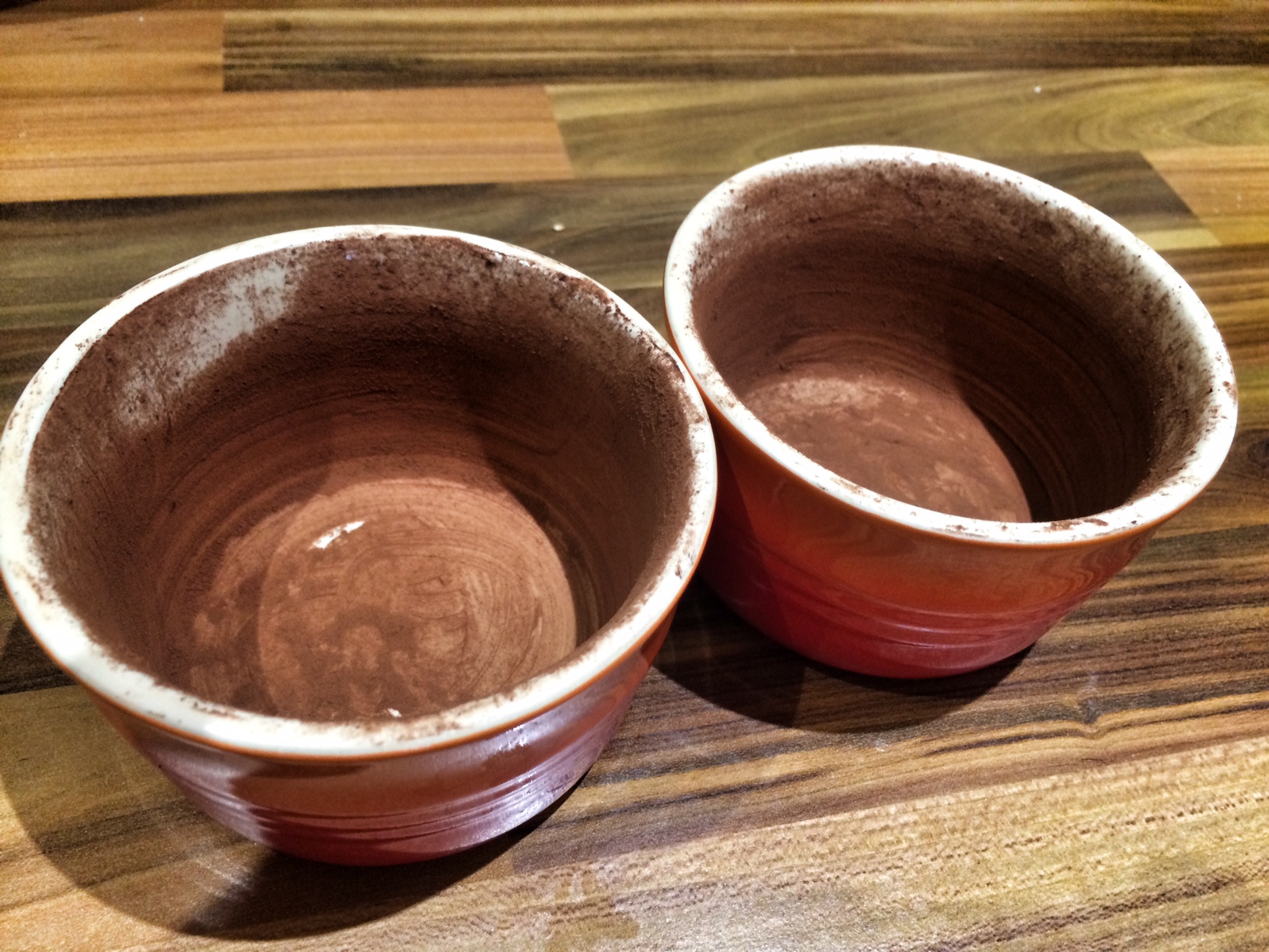 - Line 4 ramekins with butter and then a dusting of cocoa powder. If you don’t have ramekins, these fondants can be made in a deep muffin tray, although the timings will vary slightly.