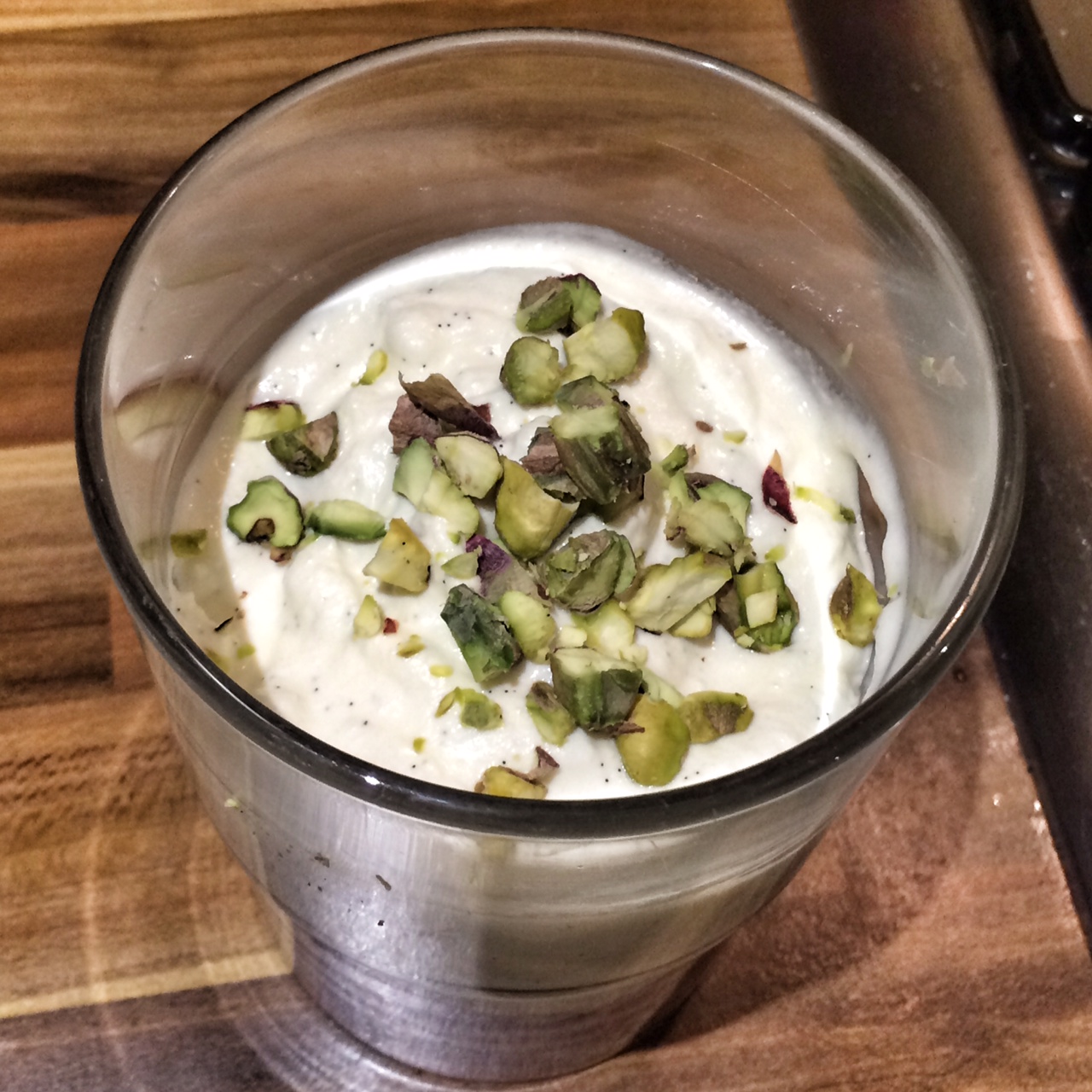 - In each glass, add your chosen fruit pieces then spoon in some of the vanilla mousse before sprinkling with pistachios. Leave to set in the fridge for a couple of hours before serving.
