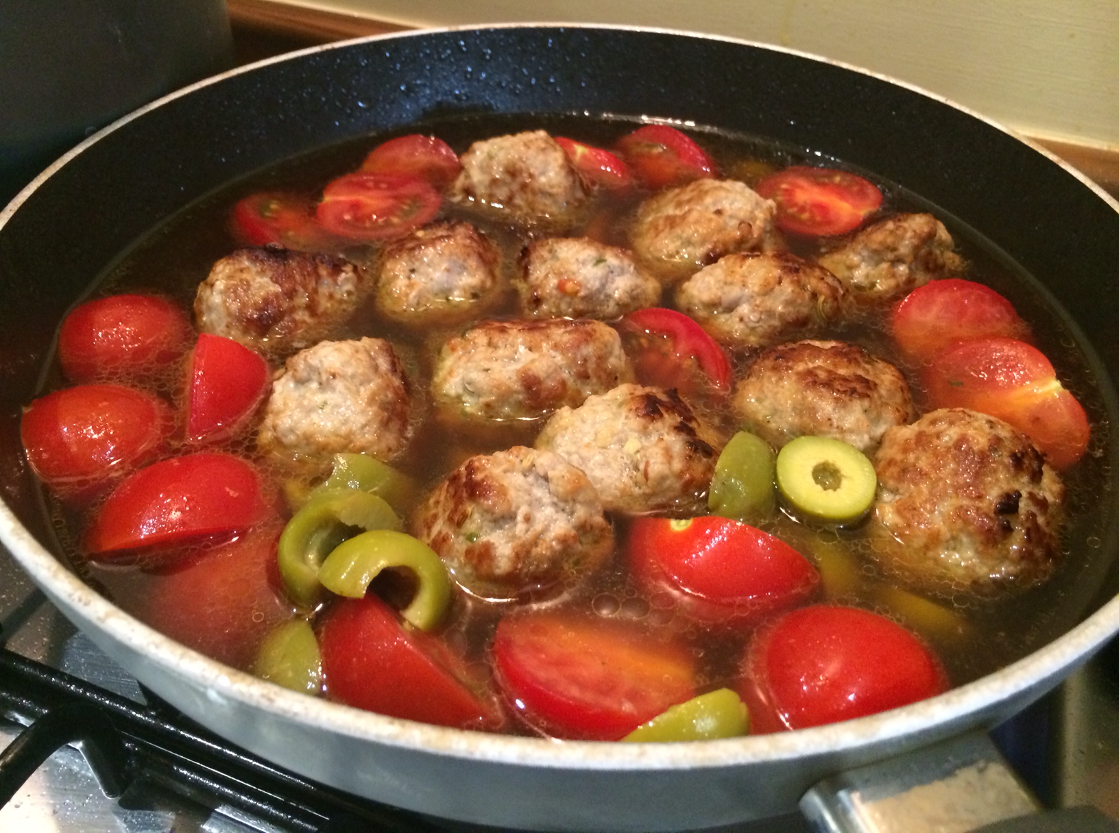 - Add the tomatoes, olive and chicken stock. Turn up the heat and leave to cook until the liquid is reduced by half.