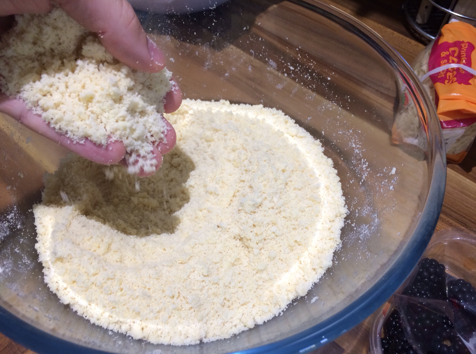 - Once the crumble mixture has achieved the consistency of coarse sand, set aside and wash your hands.