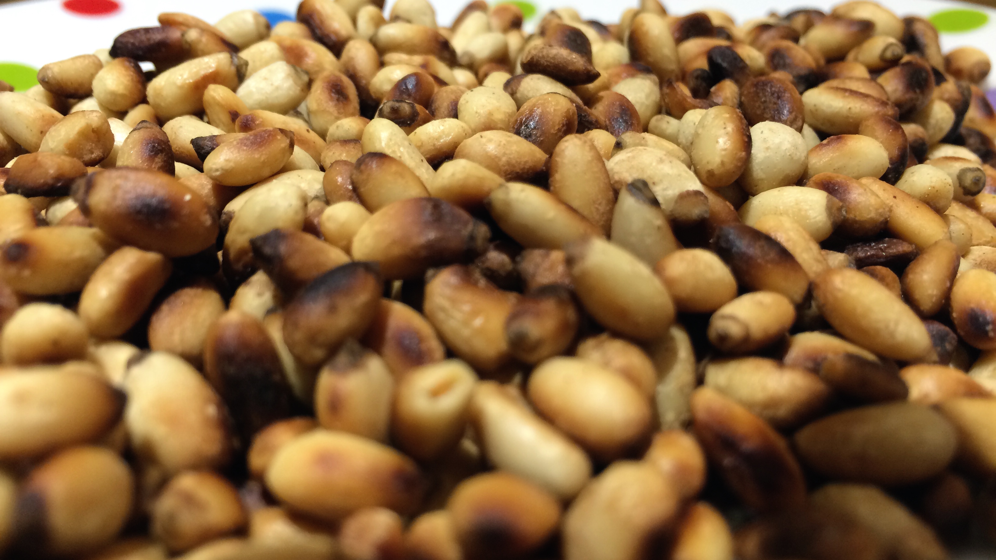 3. Put a thick bottomed frying pan (if you have one) over a medium heat and add the pine nuts (no oil required). Toss every minute until they become golden brown. Keep your eye on these as they will suddenly go black very quickly. Empty onto a plate and set aside. Pine nuts