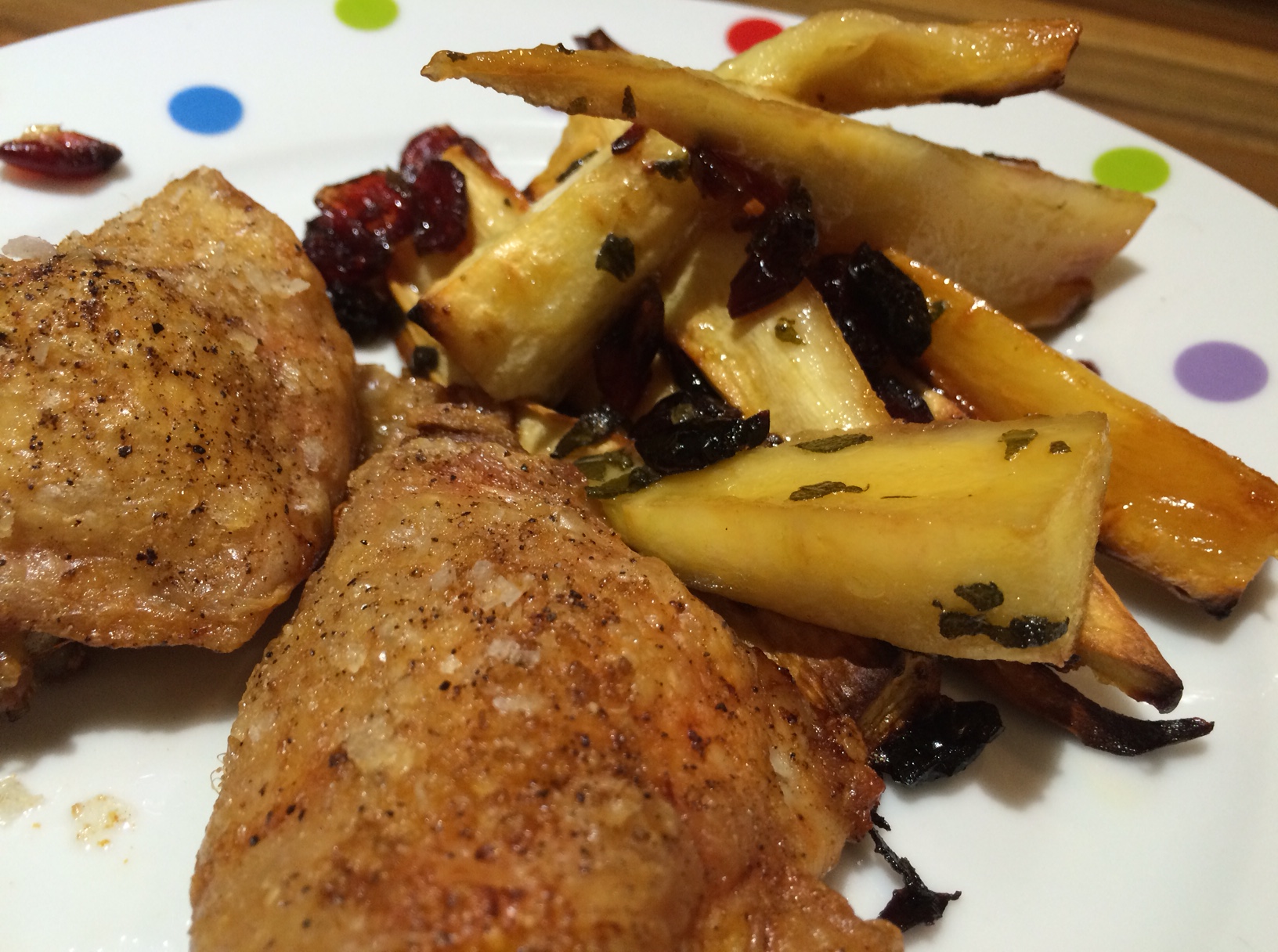 We’ve served a very simple dinner, using our parsnips as the accompaniment to roasted chicken thighs (skin on), although they are delicious with turkey or cold meats. We drizzled the chicken thighs with a little olive oil and good sprinkling of sea salt and pepper, putting them in the oven about 10 minutes after the parsnips so that everything was ready at once.