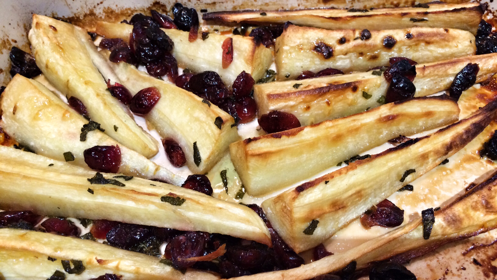- Tip the parsnips into a suitable sized roasting tray, such that there’s still a bit of space between each one, then drizzle the cranberry and sage syrup all over the parsnips. Toss around so that each parsnips piece is glazed – we found it easier to do this by hand, but use whatever implement you please.