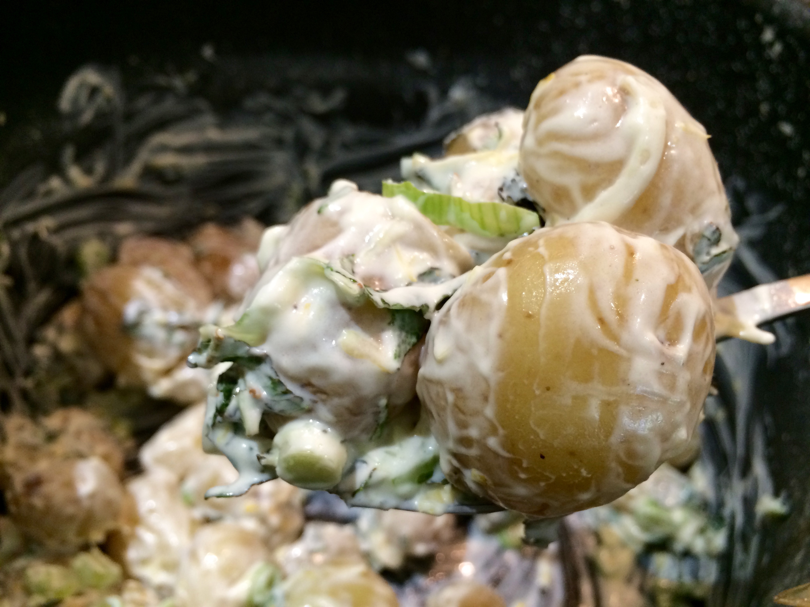 - Once tender, drain the potatoes and leave to cool for a short while (up to 20 minutes). Then gently stir together with the crème fraîche, lemon zest, mint and spring onions.