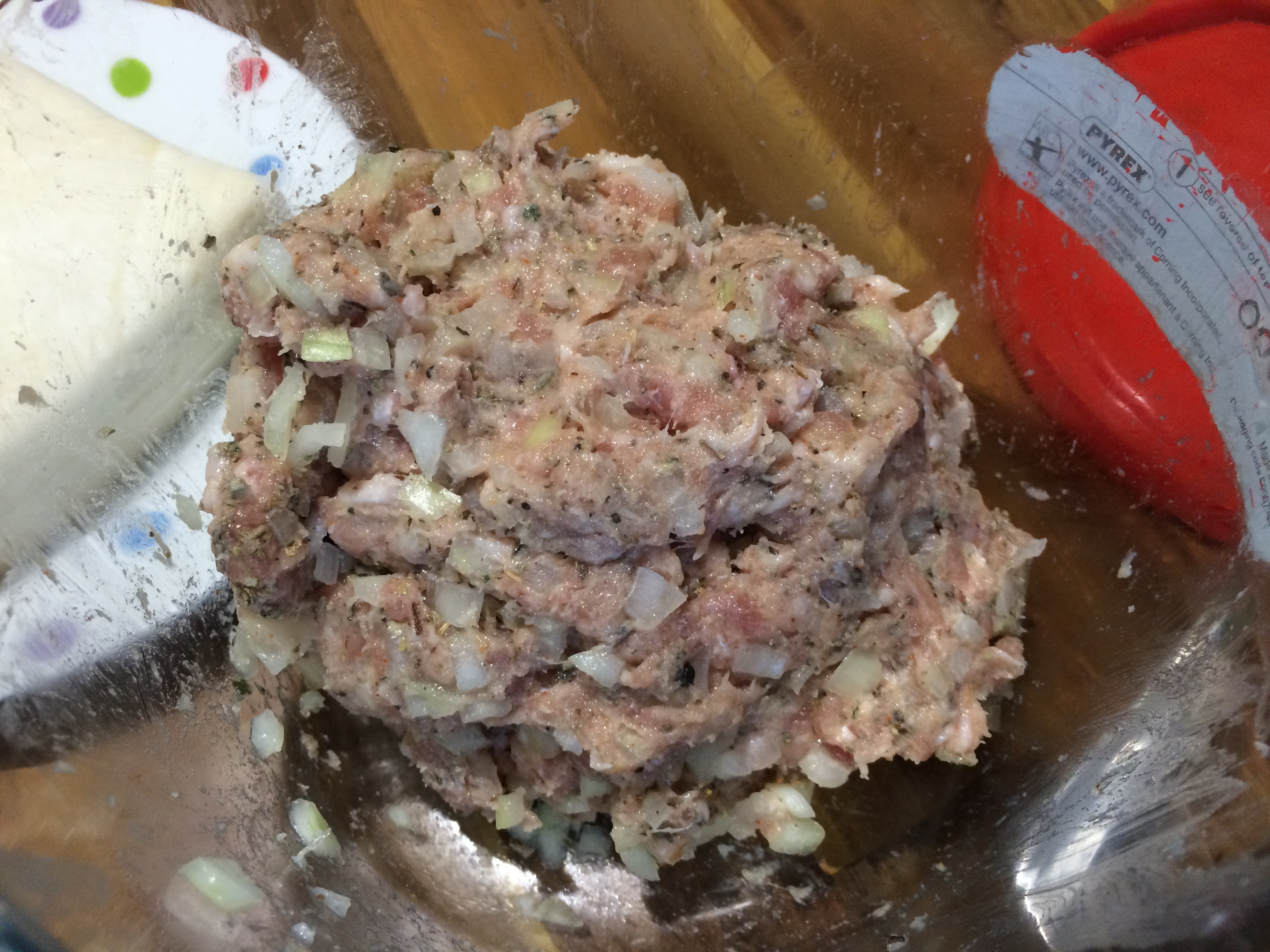 - Divide the sausage meat into two long rolls the same length as the pastry strips and place each sausage meat roll onto each pastry strip about 1.5cm from the top.