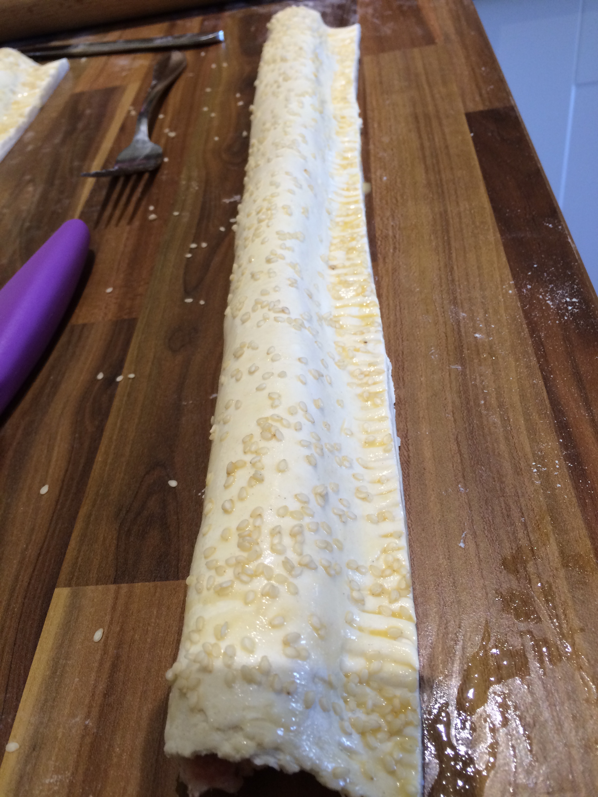 - Wash your hands and make sure they’re dry before moving onto the pastry. Lightly flour your surface and rolling-pin and roll out the puff pastry into approximately 30cm x 20cm. Cut into two long strips (of 30cm x 10 cm).
