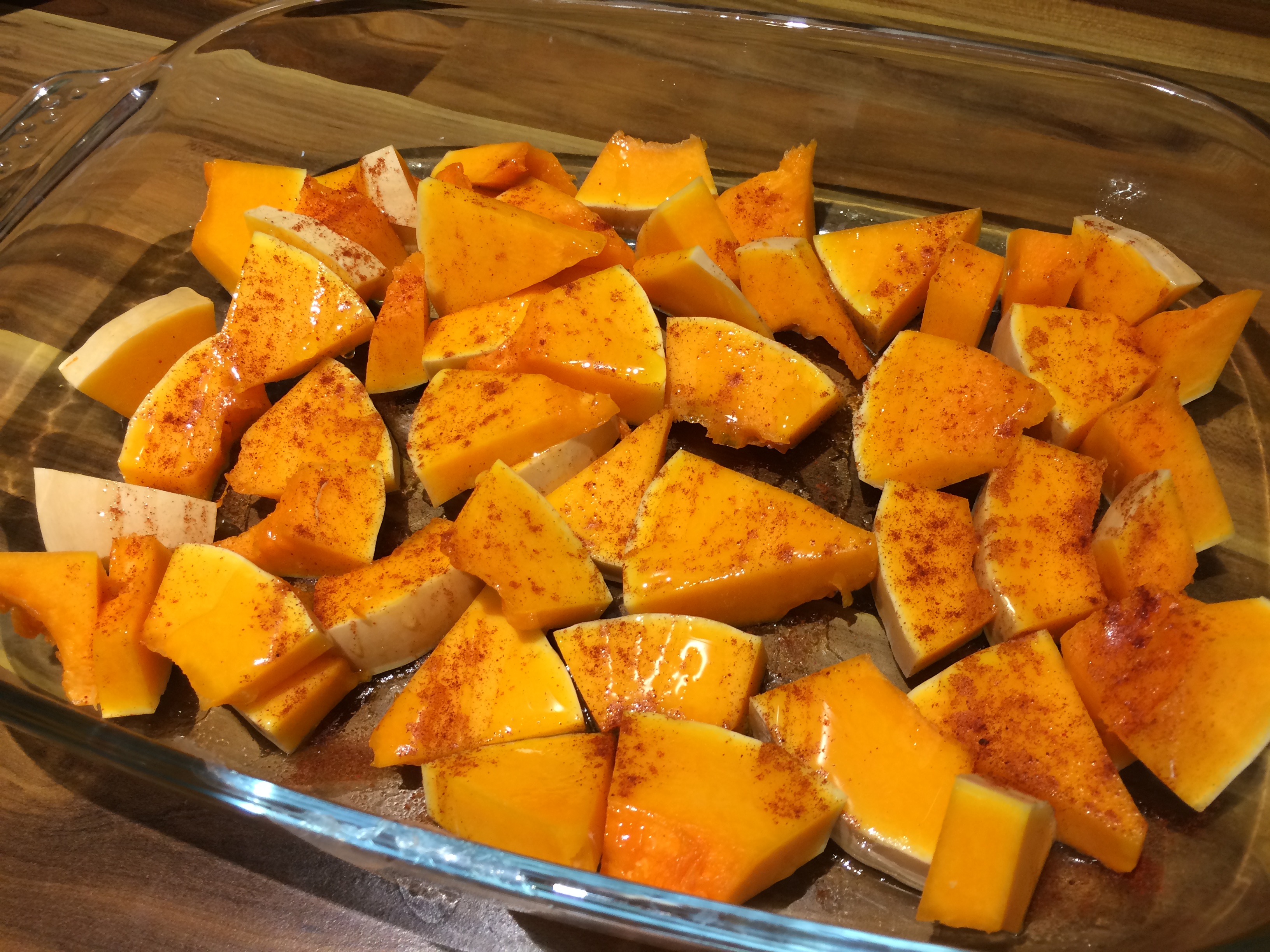 - Tip the chopped butternut squash onto a roasting tray. Drizzle with olive oil, sprinkle with the smoked paprika and a little salt. Put in the oven and cook for 25 minutes.