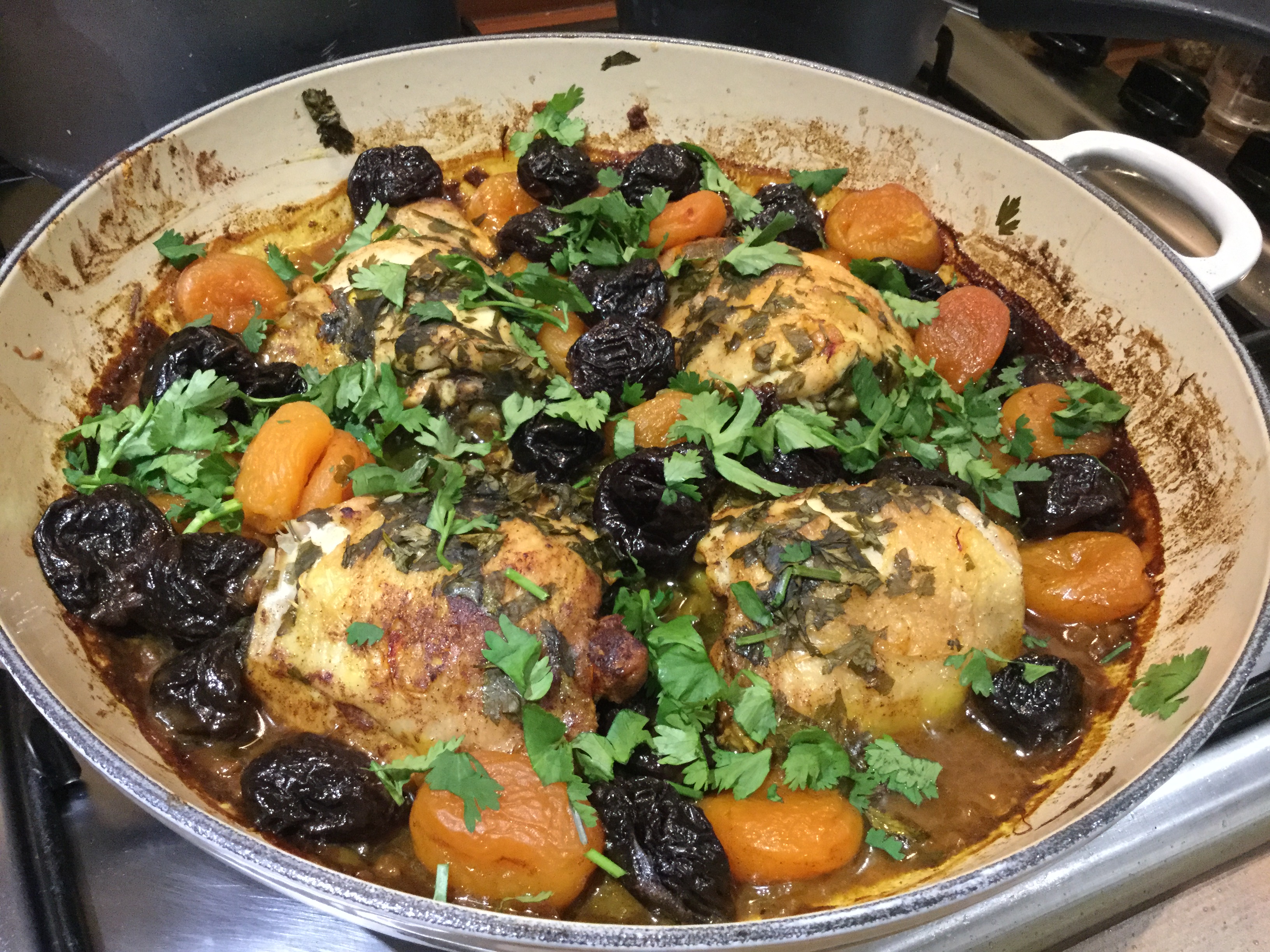 - After that time, add the apricots and prunes with just less than half of the chopped coriander and parsley. Replace the lid and cook in the oven for a further 40 minutes.