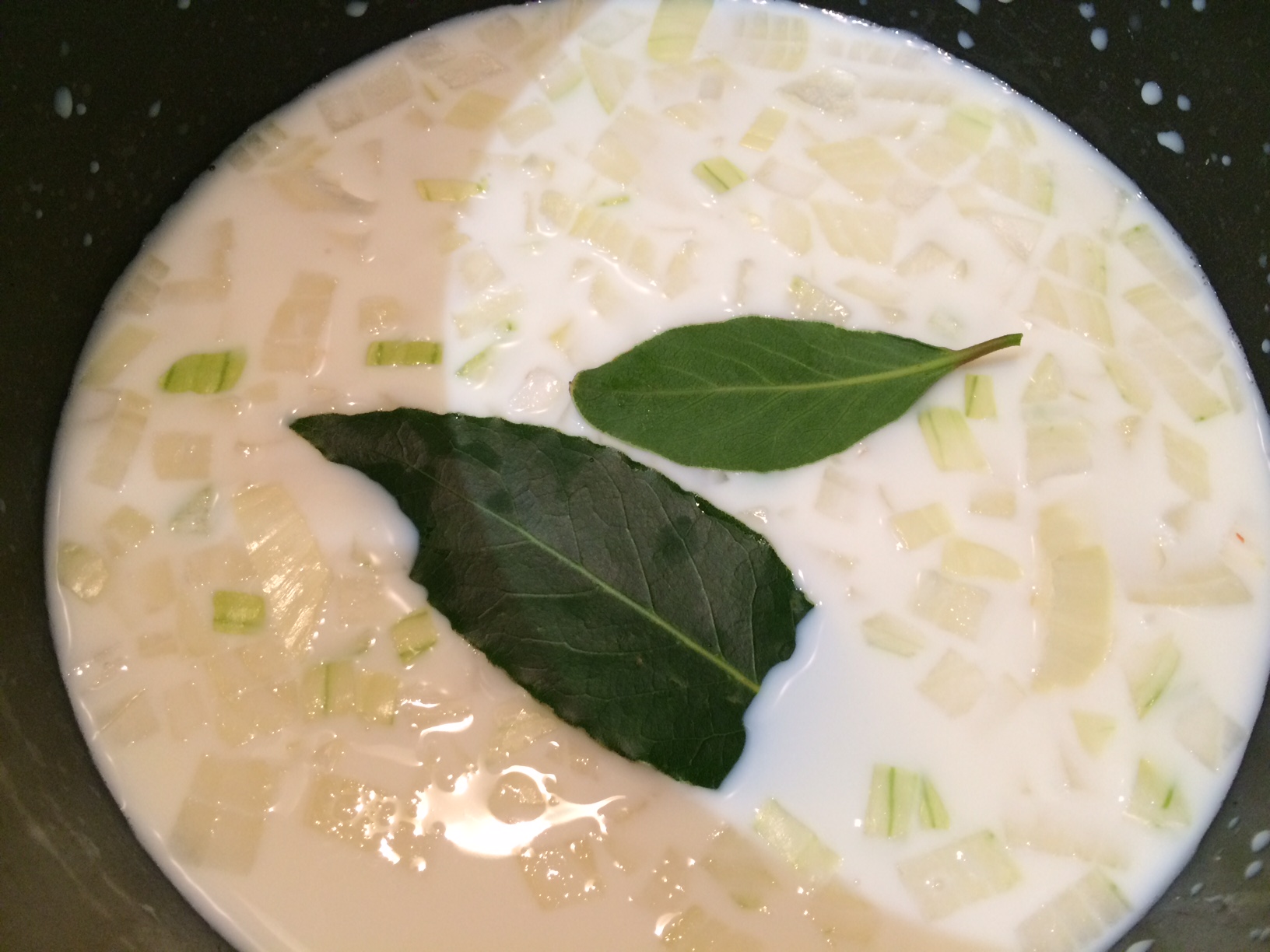 - Pour the milk into a saucepan with the bay leaves and chopped onion. Bring to a simmer over a low heat.