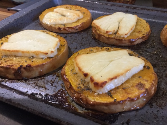 - In the meantime, slice the halloumi and then place a piece of the hard cheese onto each slice of butternut squash and bake for a further 10 minutes until just golden around the edges.