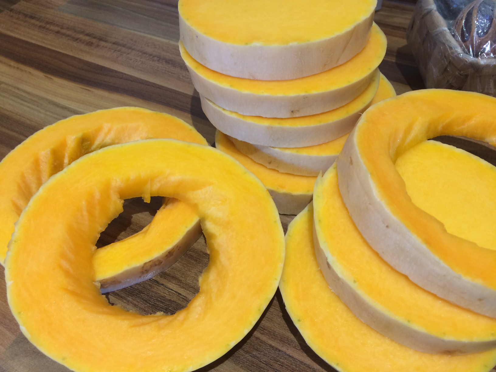 - Pre-heat the oven to 200ºC. Wash the butternut squash and slice into rounds about 1.5cm thick, starting at the thin end. As you approach the bulbous end of the squash (which contains all the seeds), you can either stop or continue to cut and scoop out the seeds – the leftover rings can be used for roast vegetables in another recipe.