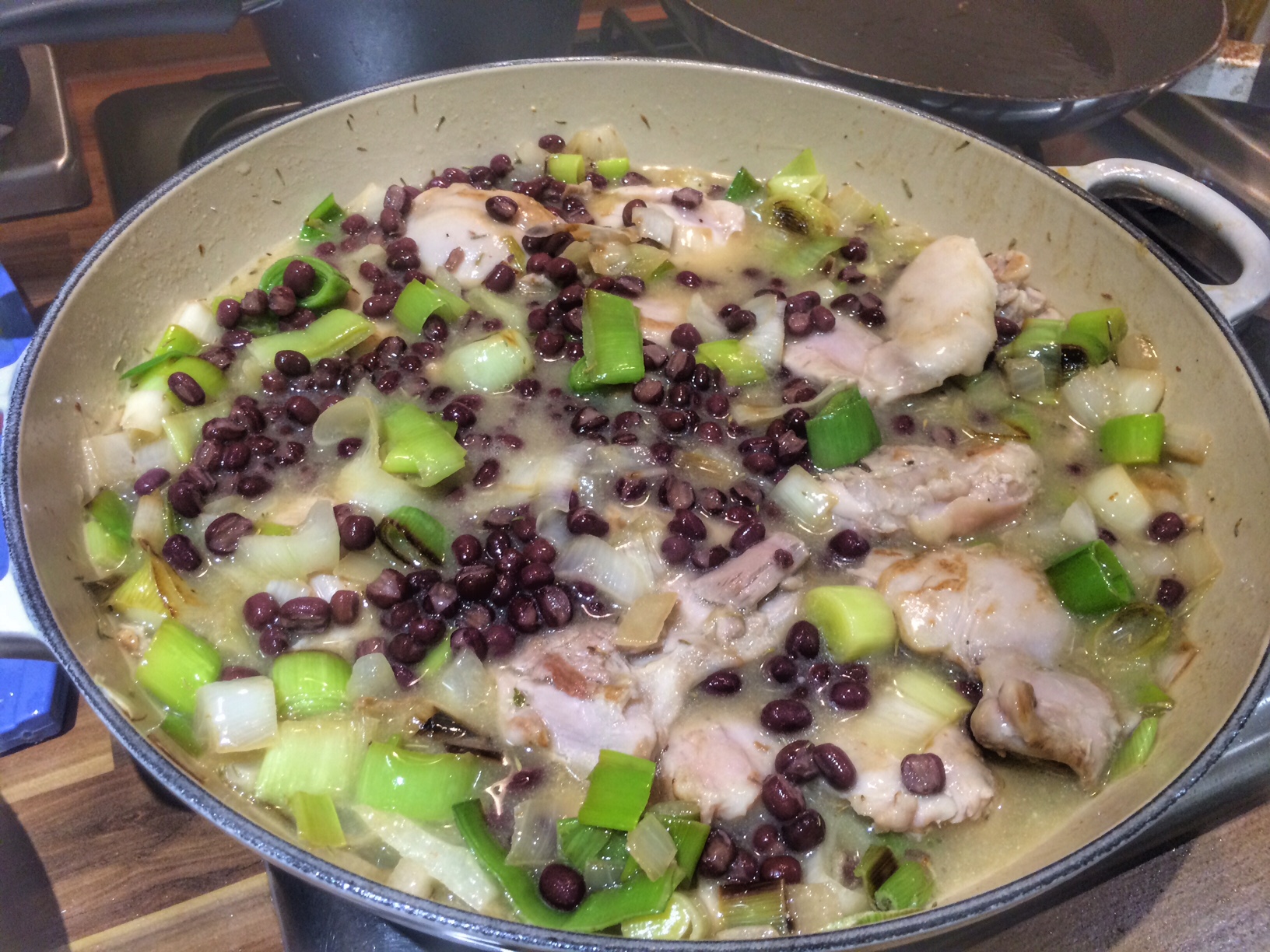 - Return the chicken, leeks and onion to the pan carefully then add the aduki beans. Give everything a quick stir and then bring to a gently bubble.