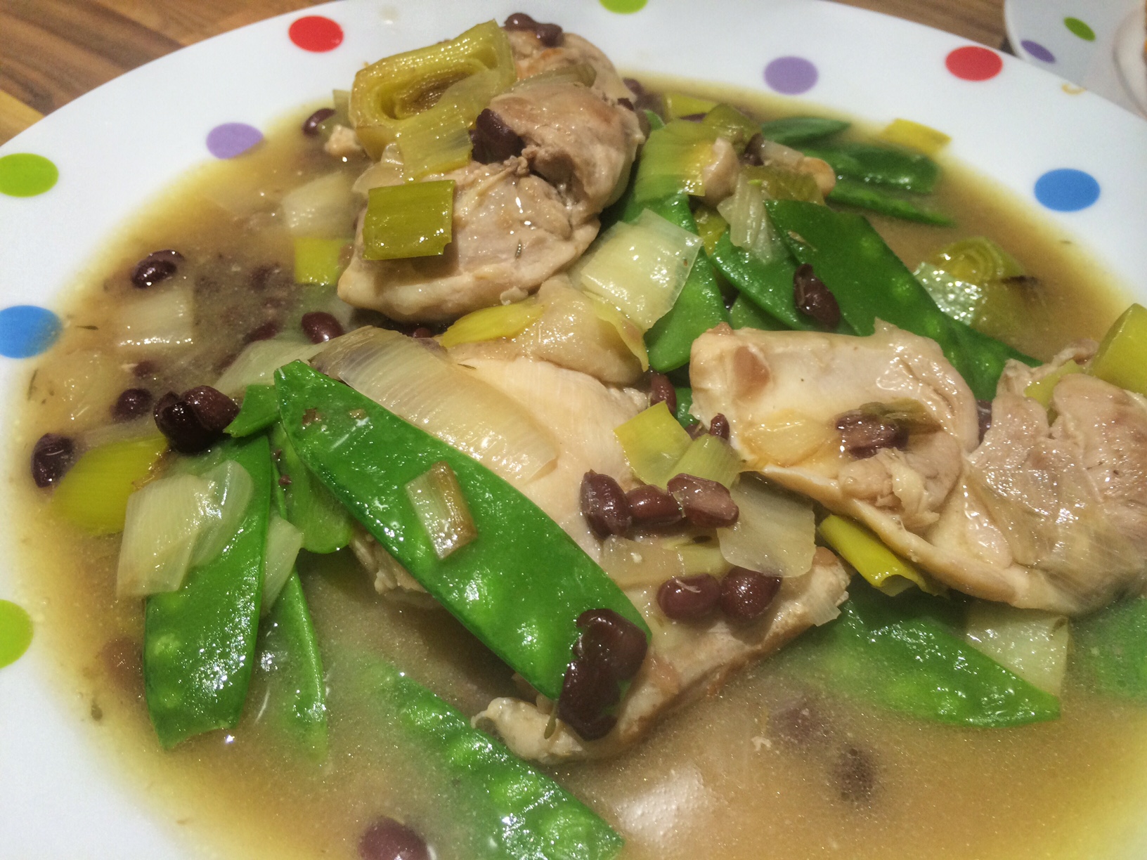 As the weather has turned slightly warmer we look to lighter and greener dishes but still warming enough if there’s a last-minute chill in the air. This week sees us cook up a chicken and leek casserole with aduki beans and sugar snaps for colour, crunch and contrast. The list of ingredients may seem long, but each item is needed and the cooking time is worth the wait.