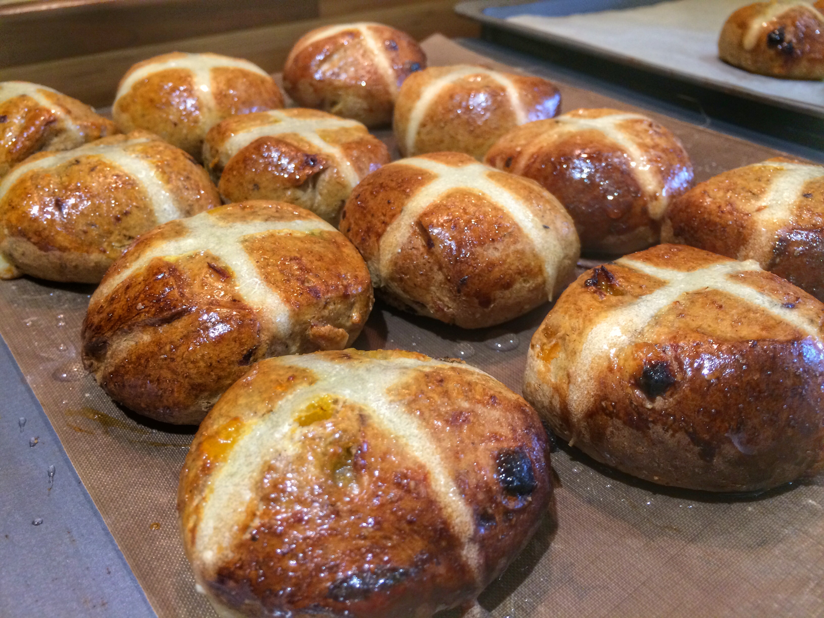 - Bake for 15 – 20 minutes, until risen and golden brown then remove and leave to cool. While they are still warm, quickly make a sugar syrup (dissolve 1 tbsp of sugar in 1 tbsp hot water) and brush each hot cross bun for a shiny glaze.