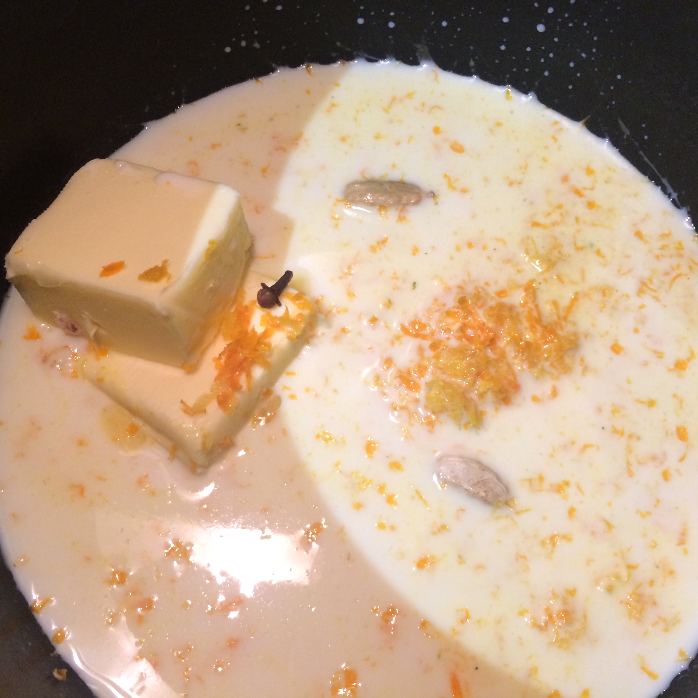 - Put a saucepan over a low heat, into which pour the milk and add the butter, orange zest, clove and cardamom pods. Simmer gently for several minutes until the butter has melted, but do not let the milk bubble.