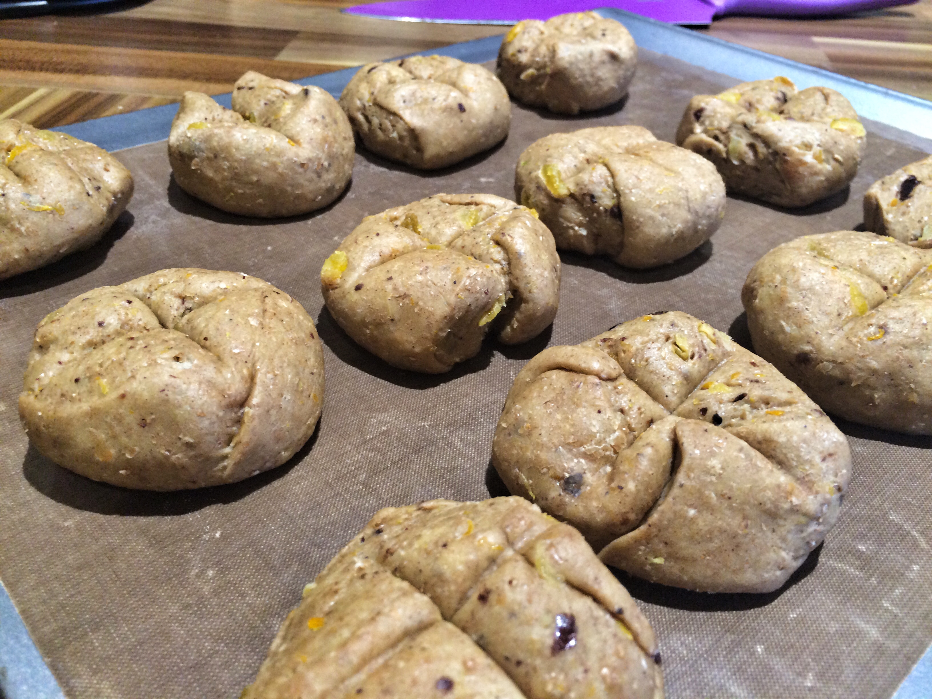 - Knock the air out of the dough and then divide into 16 small balls. Place each on a lined baking tray. Make a cross indentation with the back of a knife. Cover and leave to prove for a 2nd time for 45 minutes.