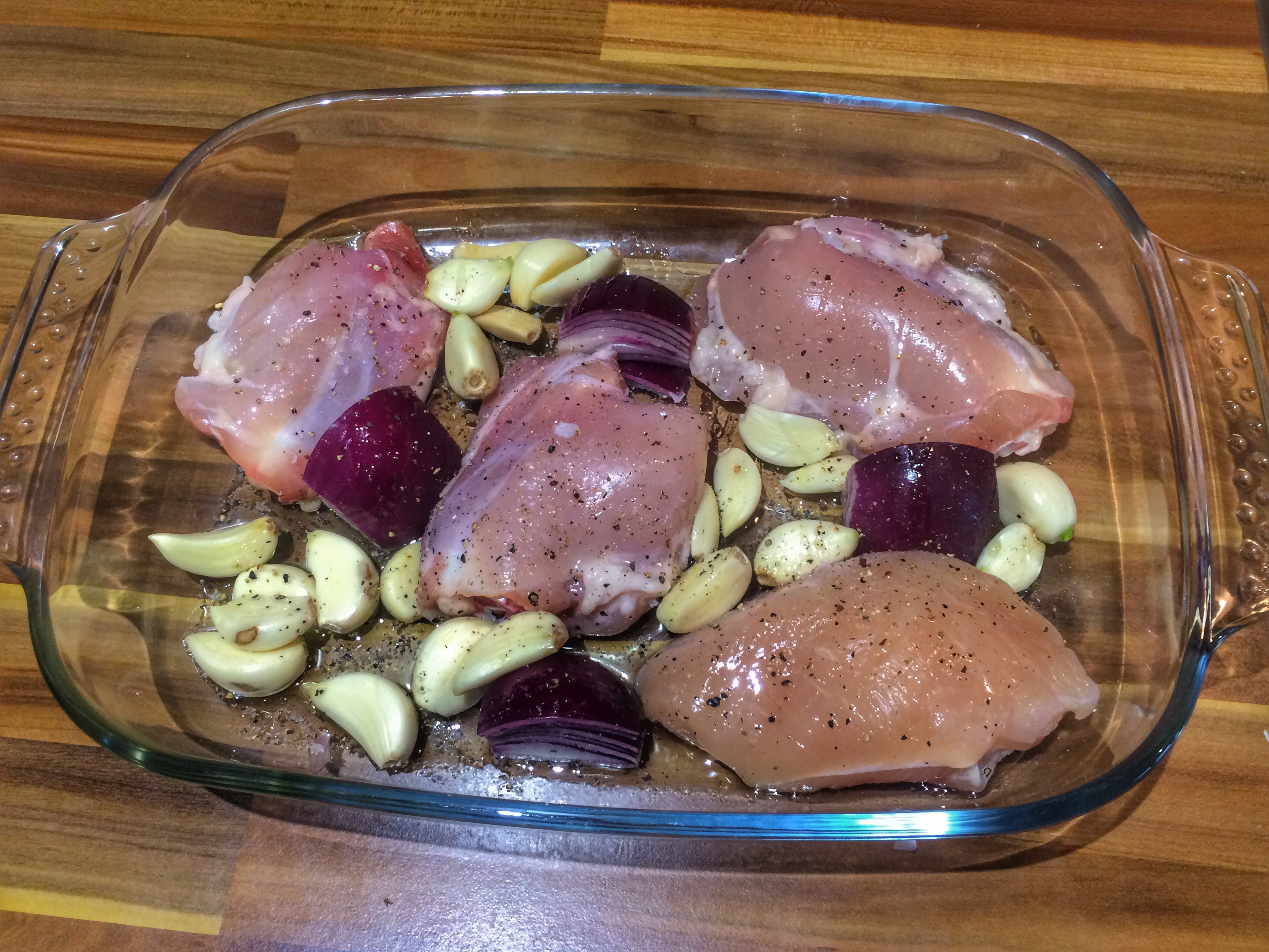 - Put the garlic cloves, chicken thighs and onion in a baking tray. Drizzle with olive oil and season well with sea salt and freshly ground black pepper.
