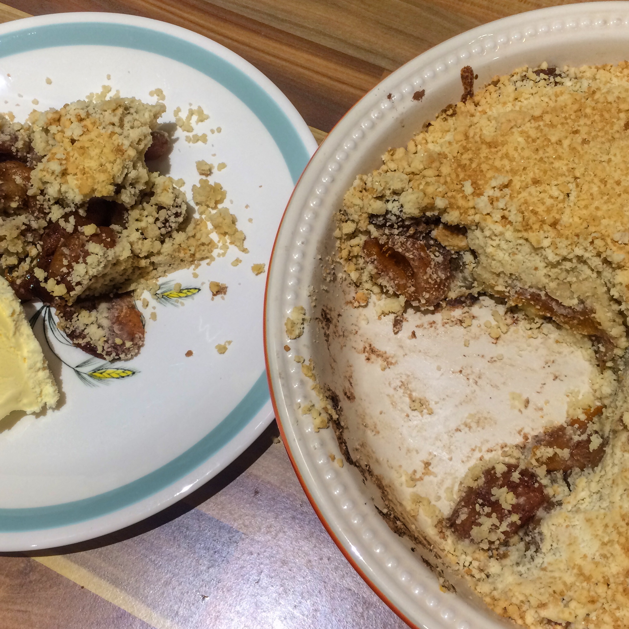 - Meanwhile prepare the crumble topping. Weigh out the flour and ground almonds into a large mixing bowl and sprinkle over the remaining cinnamon. Cut the cold (just from the fridge is ideal) butter into cubes and add to the bowl.