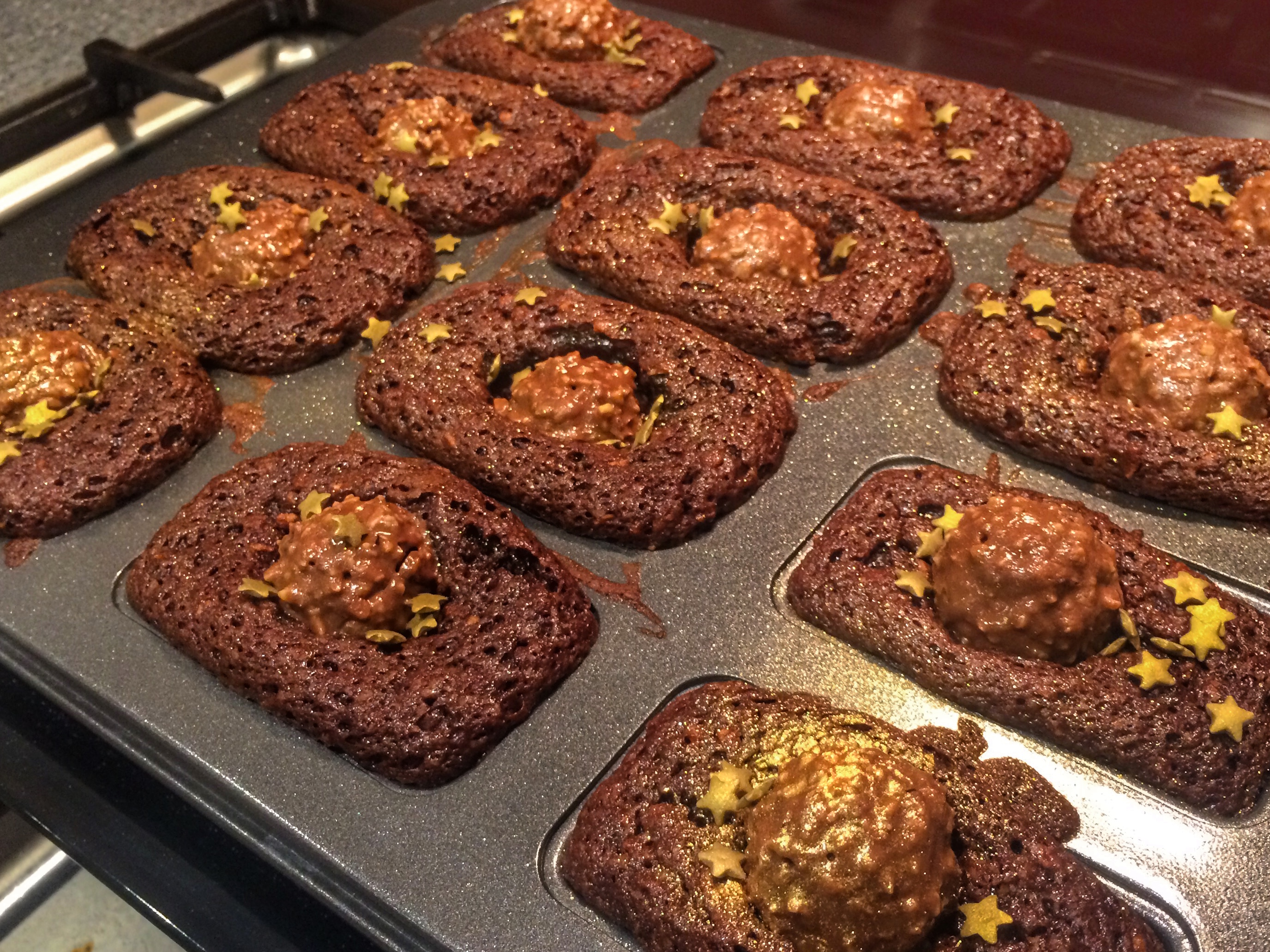 - Remove the Ferrero Rocher from the freezer and push one into each square of brownie. Pop back in the oven and bake for a further 5 minutes. The brownies should be just cooked and still squidgy inside.