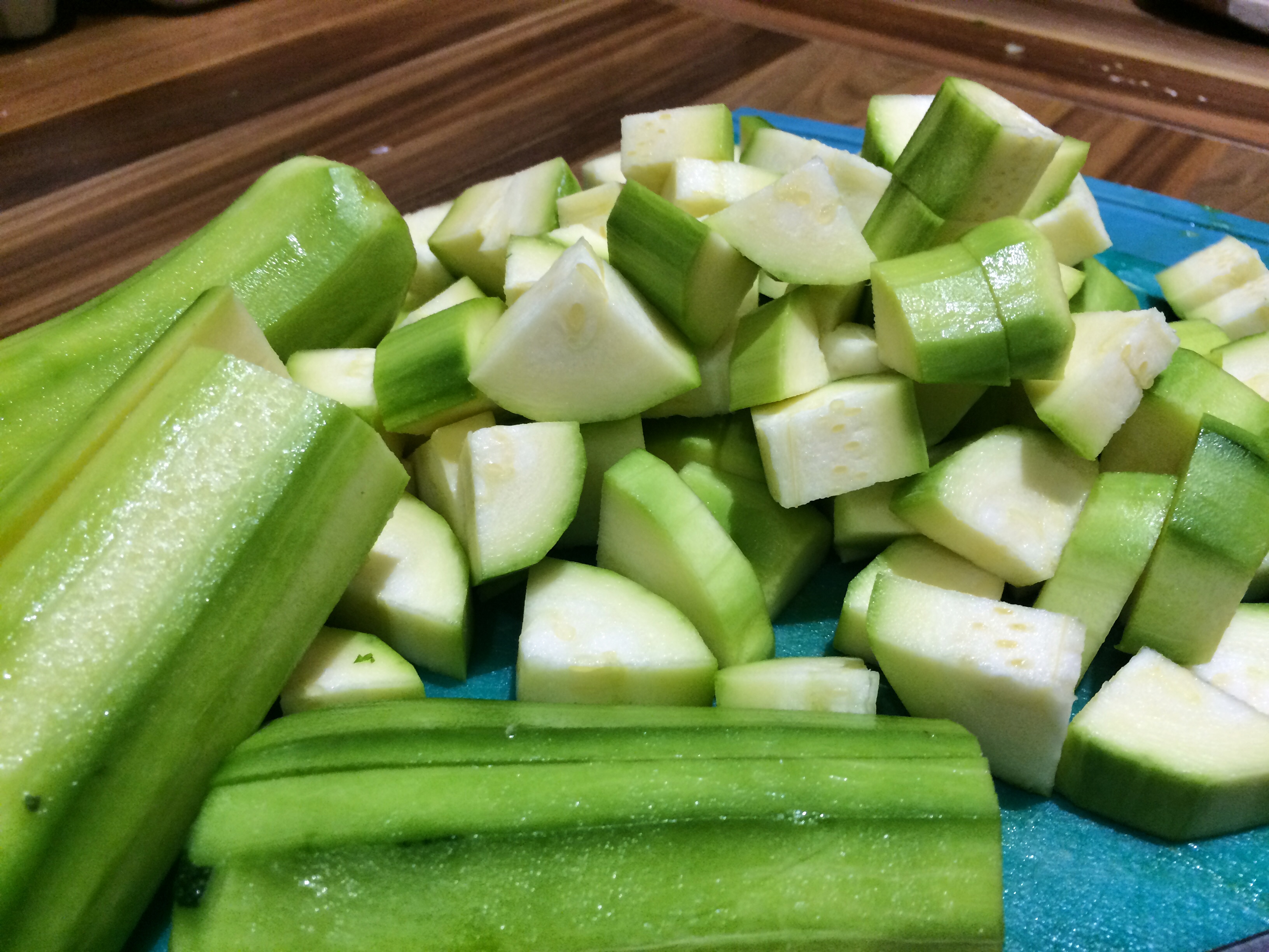 - Whilst you’re letting the mixture come to a gentle boil, peel the remaining courgettes, quarter each lengthways and then chop into 1cm pieces.