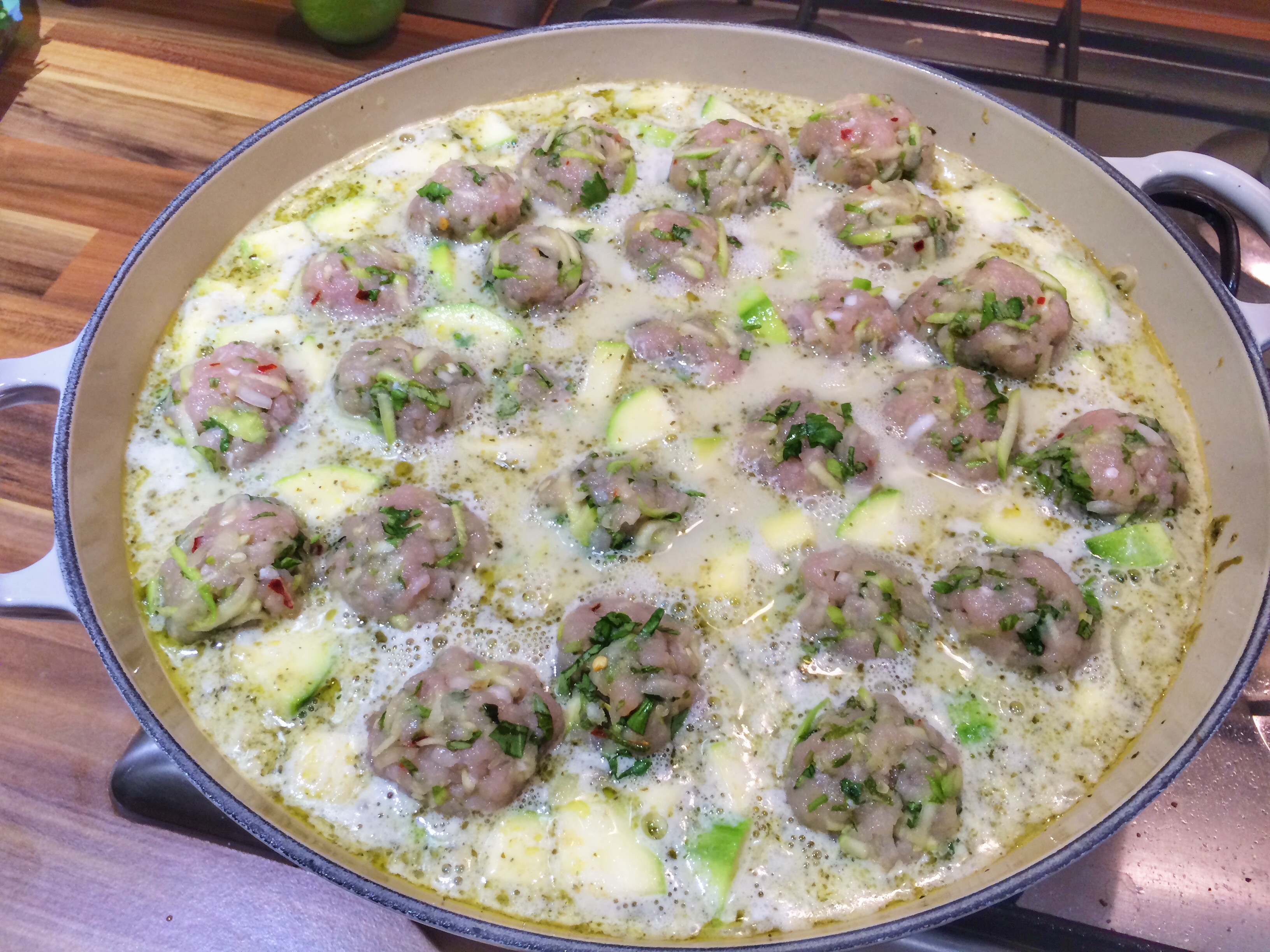 - Add the courgette pieces of the bubbling broth and then carefully place the turkey meatballs in the pan as well, being careful not to break them up. Once the pan has just started bubbling again, turn down the heat and simmer for 20 minutes with the lid on.
