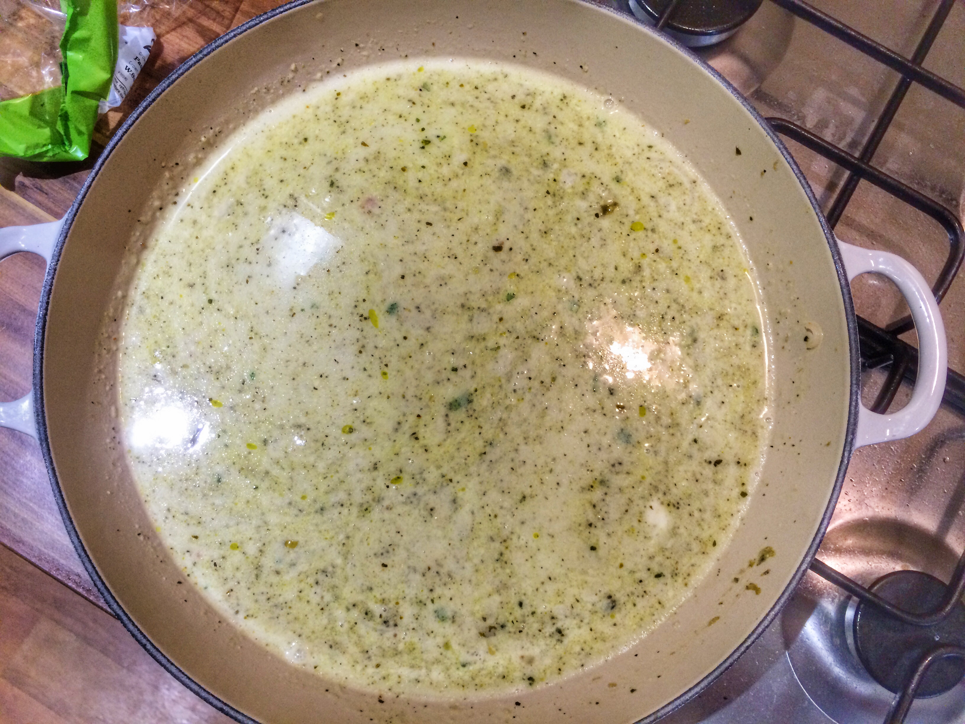 - Add the Thai green curry paste, the cream from the top of the coconut milk and whisk together in the pan, before adding the rest of the coconut milk, fish sauce and chicken stock.