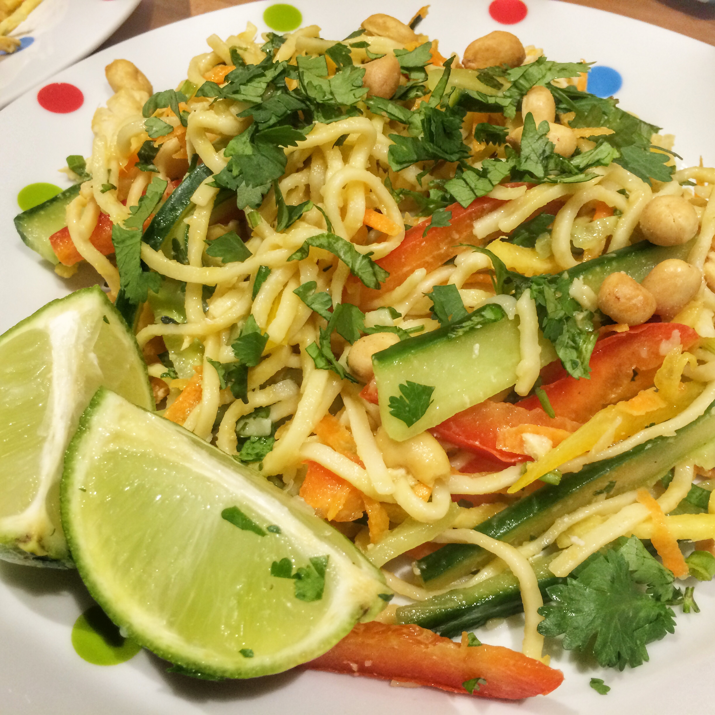 - Add all the vegetables to a large bowl with the cooked noodles, chicken, peanuts, beansprouts if using, and most of the coriander (reserve a small amount as garnish).