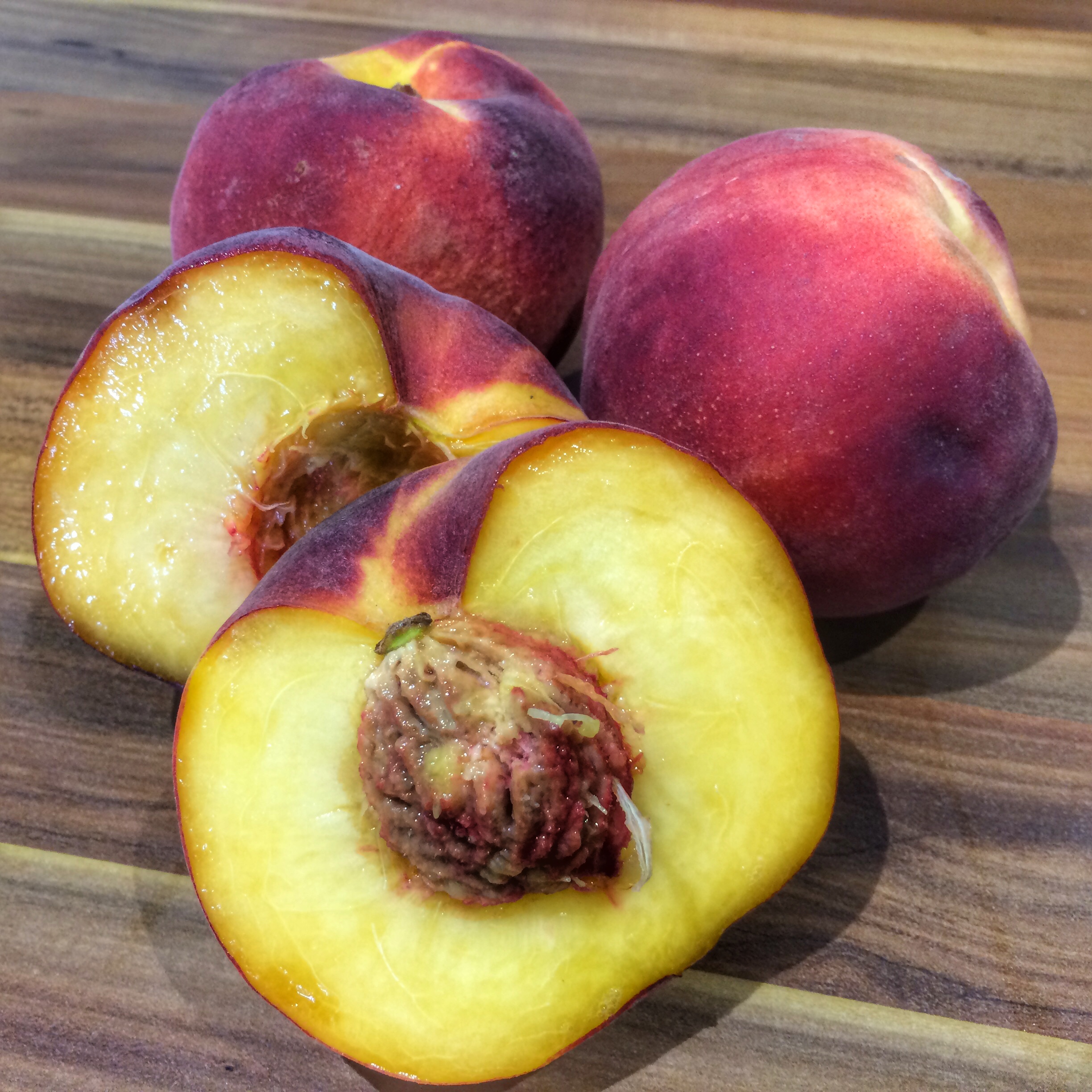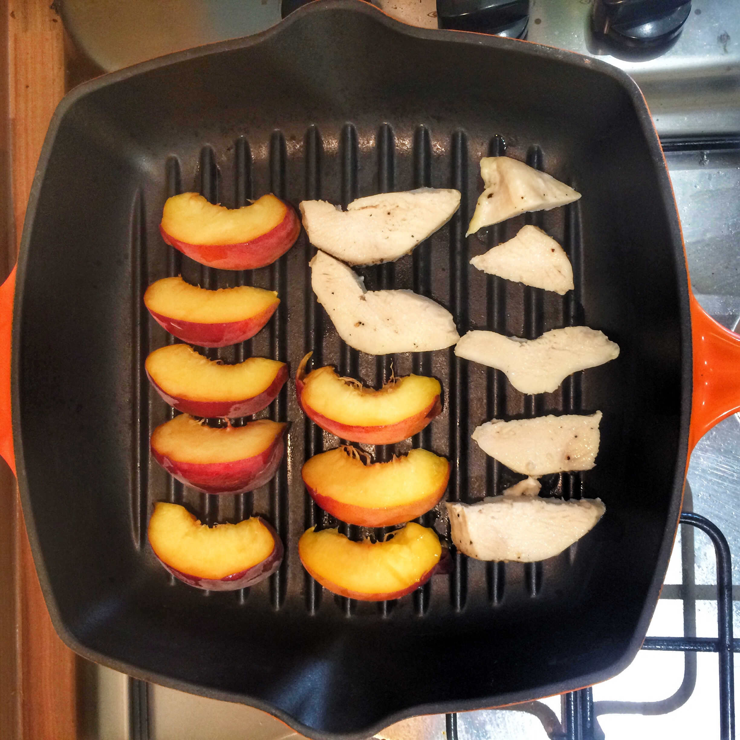 - Put a griddle pan on the cooker and heat over a medium flame. Meanwhile slice up the peaches into eighths and cut the chicken breast into slices.