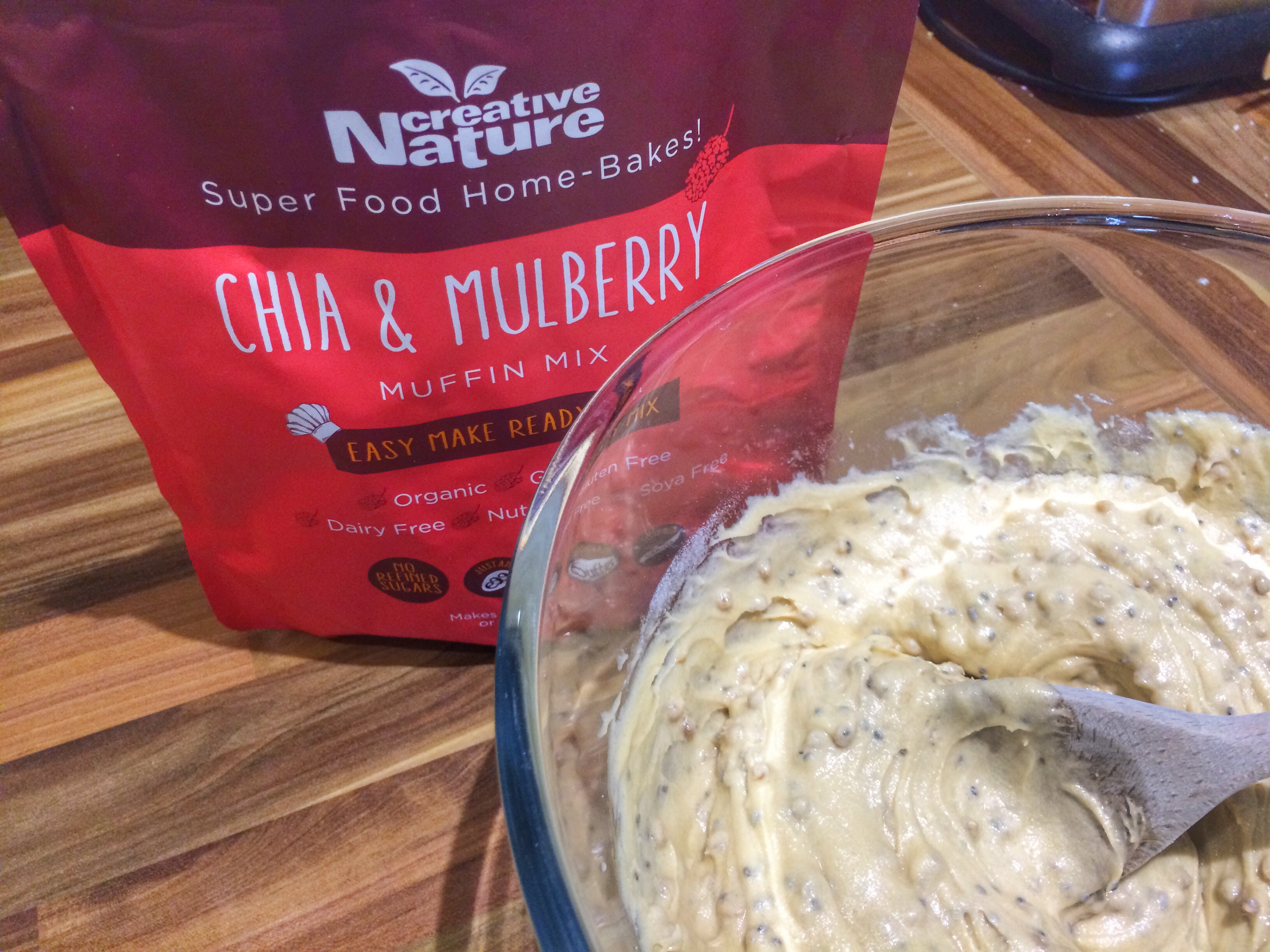 - In a large bowl, mix together the 4 eggs, Creative Nature Chia and Mulberry muffin mix, butter and vanilla extract until well combined. Split between the 12 muffin cases and bake for 25 minutes.
