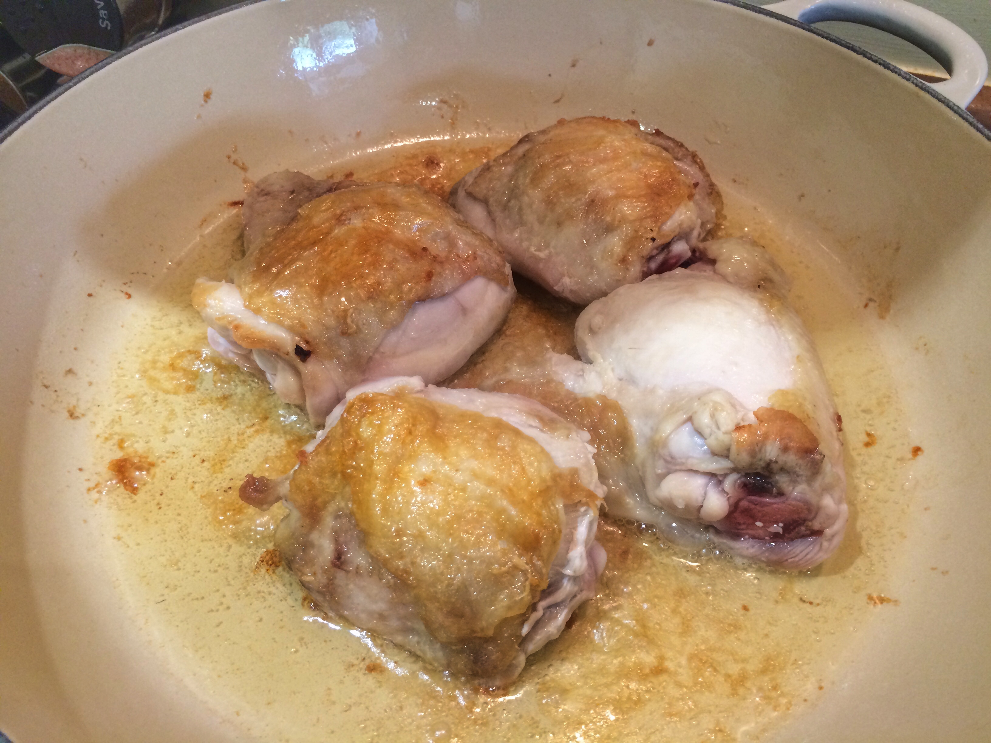 - The chicken skin should have rendered some fat, and left a few sticky bits (flavour) at the bottom of the pan. Add a small glass of white wine to de-glaze and leave to bubble away for a few minutes until the alcohol has evaporated. Then add the chopped onion and garlic and fry gently for 3 – 4 minutes, or until soft.