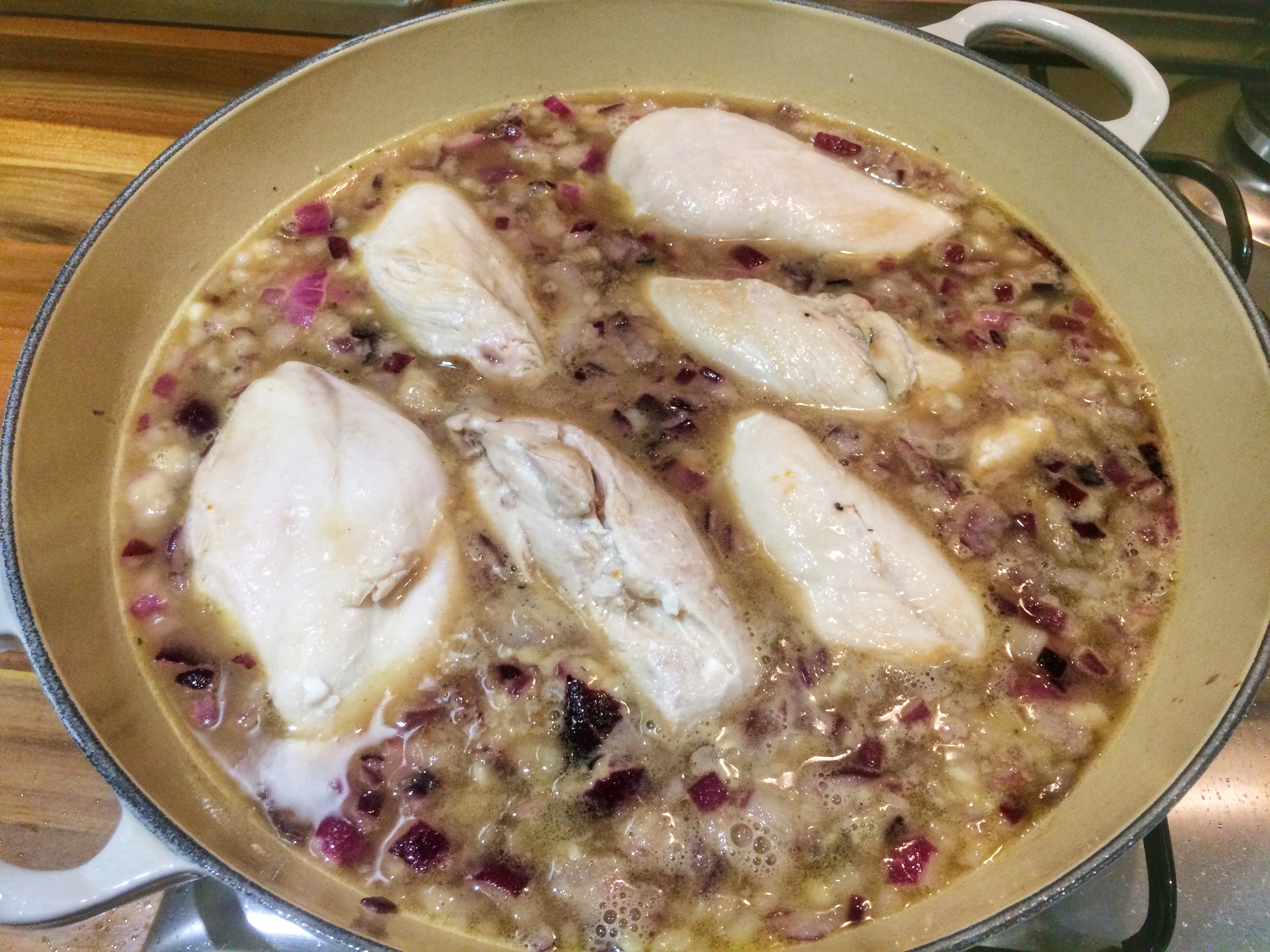 - Meanwhile heat a couple of tablespoons of olive oil in a large baking dish (preferably with a lid, but not crucial as tinfoil makes a suitable alternative). Cook the chicken on all sides, until the meat browns but is not cooked all the way through.
