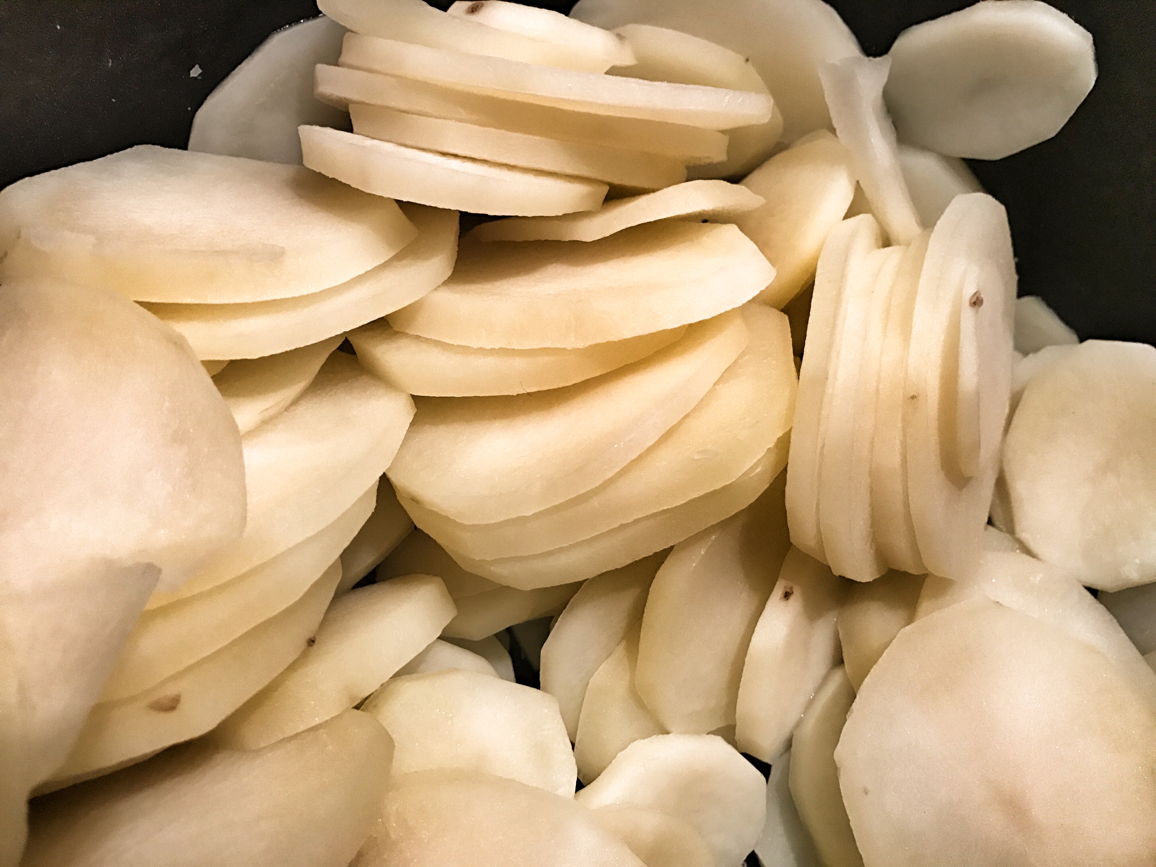 - Peel and thinly slice the potatoes, using a mandolin if you have one for consistent thickness, if not just take your time about aiming for ¼cm thick.