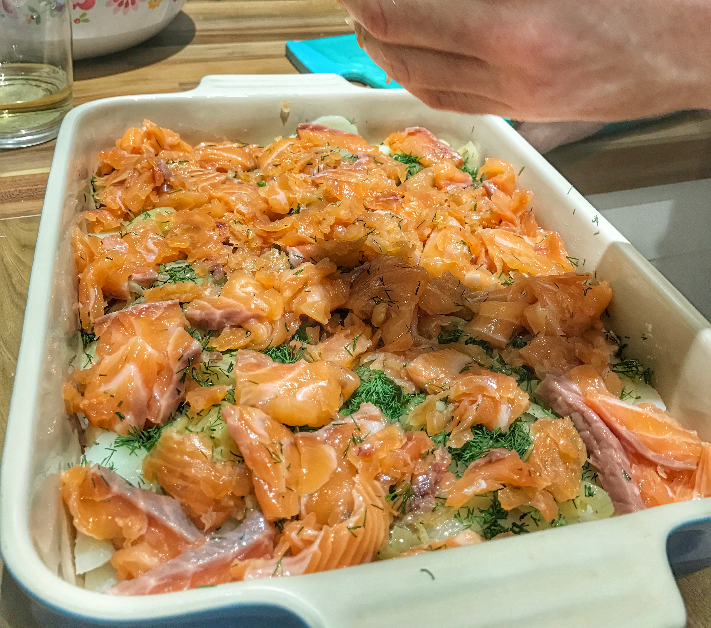 - Layer up in a large (32cm) rectangular baking dish, starting with a layer of potato then a layer of each type of salmon, a sprinkle of dill, then onions. Repeat and top with a final layer of potatoes.