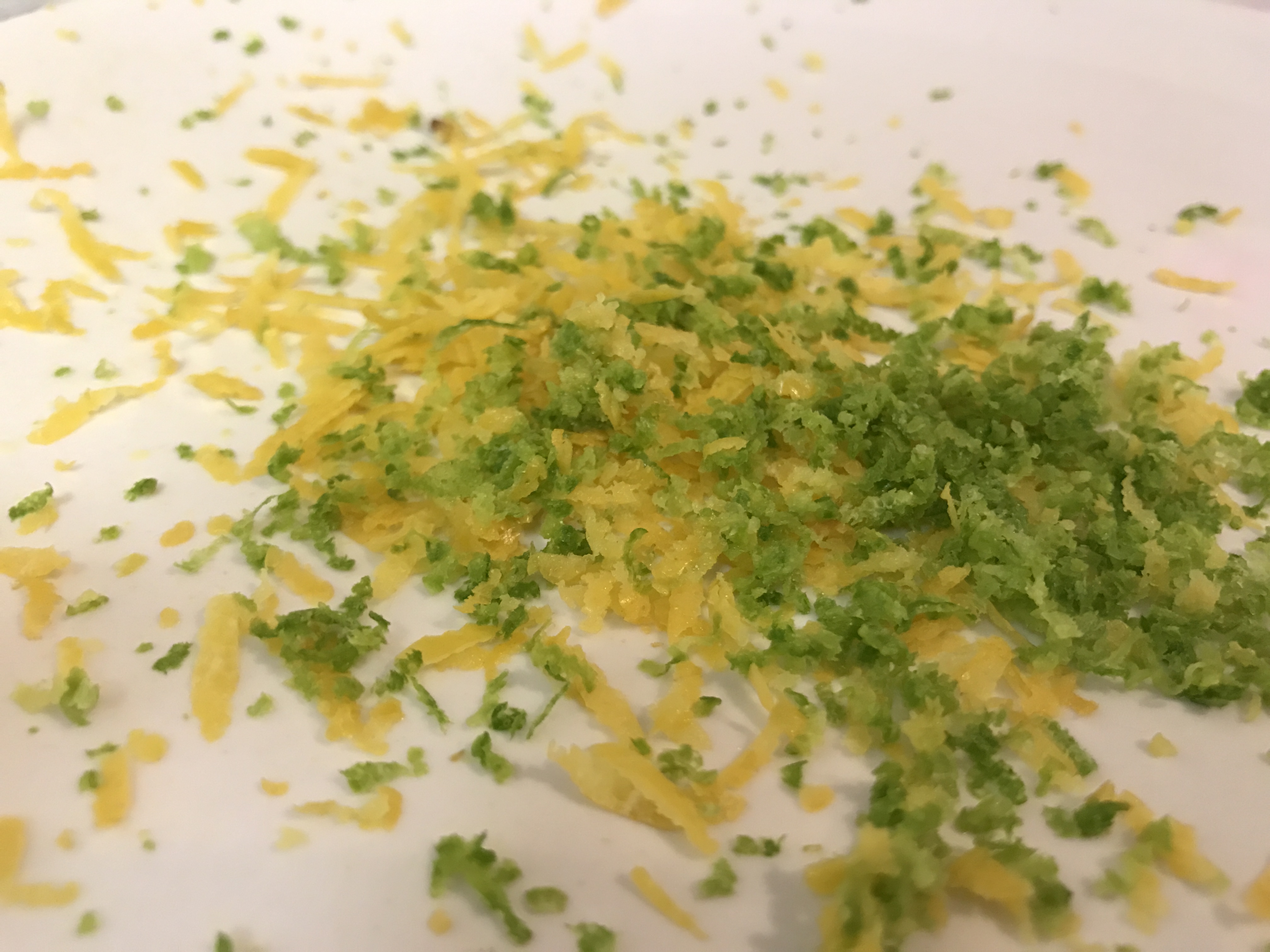 - Pour over the icing until the top of the cake is covered, decorate with a scattering of zest from a lime and lemon, and serve.